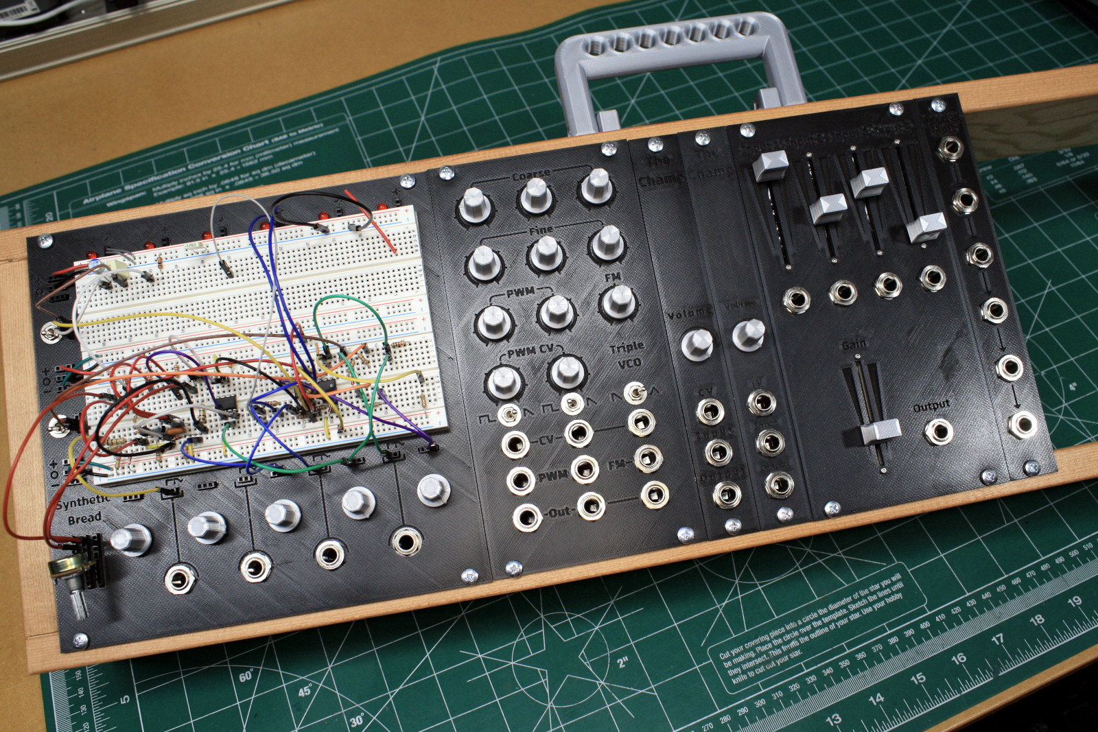 Synthetic Bread - A prototyping module that gets power from the main power supply, has a bunch of LEDs, pots, switches and jacks, and a breadboard to prototype new modules on.